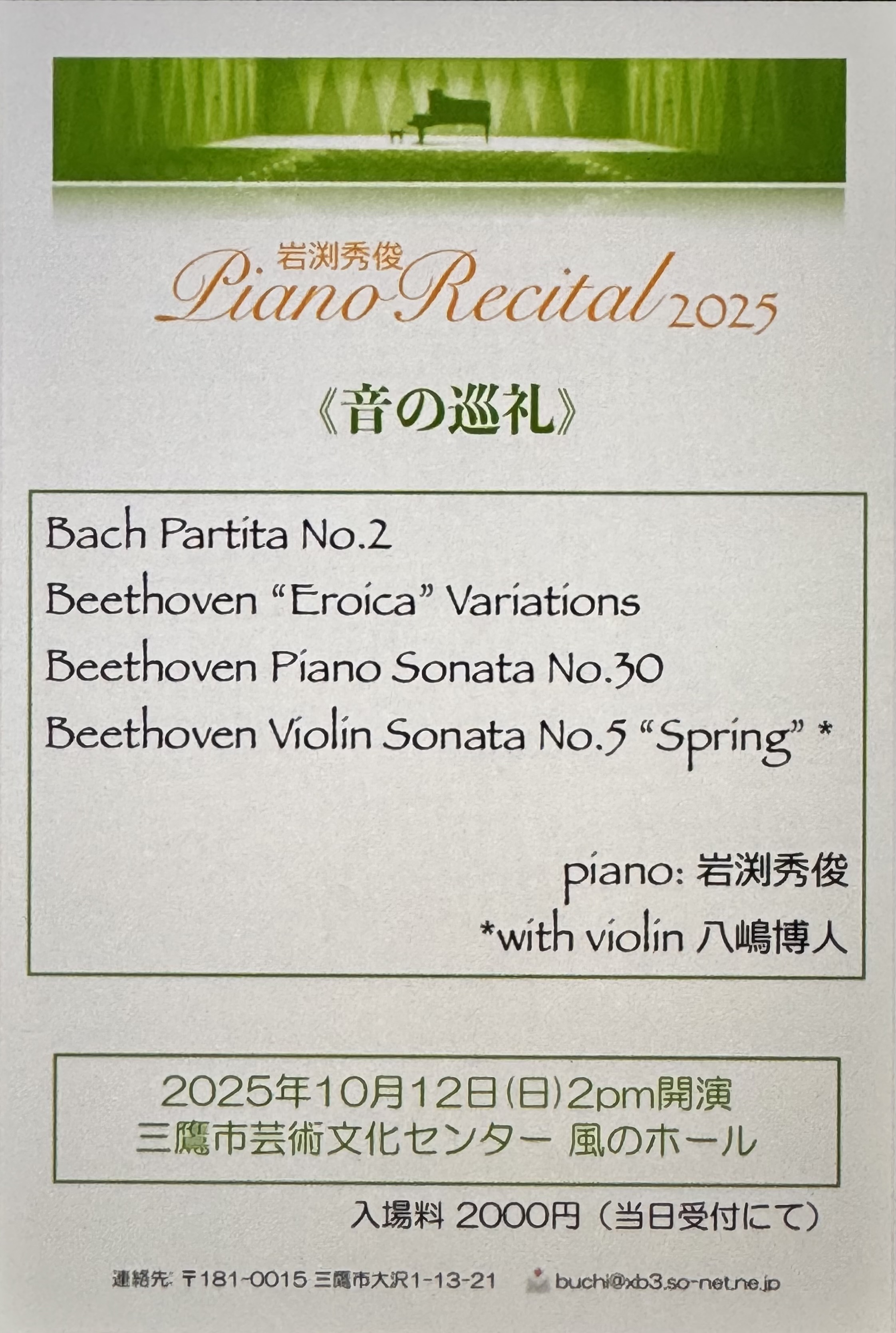 岩渕秀俊ピアノリサイタルに賛助出演(博人) ベートーヴェン/ヴァイオリンソナタ第5番"春" チラシ |