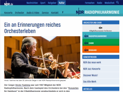 | 八嶋博人は30年以上にわたりヴァイオリニストとしてNDRフィルハーモニーで演奏をした。 彼は1987年から団員であった。NDRが「ハンブルクのためのコンサート」でエルプフィルハーモニーに客演した後、八嶋は引退した。